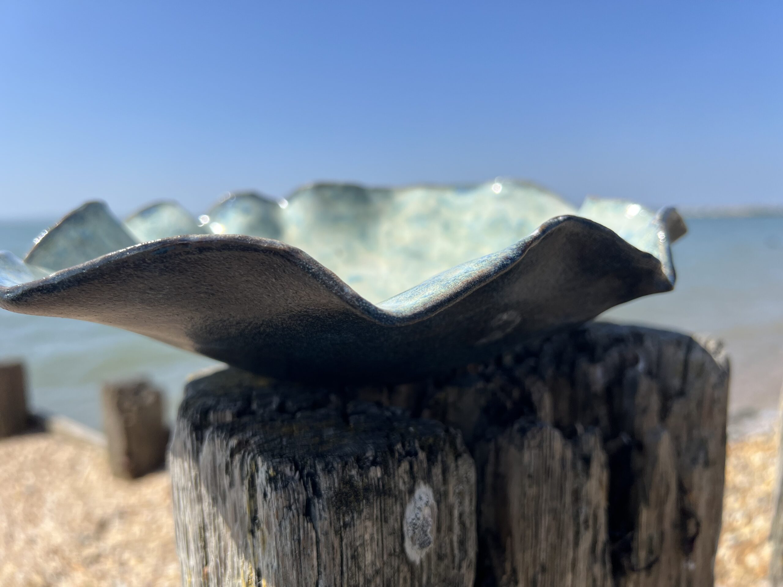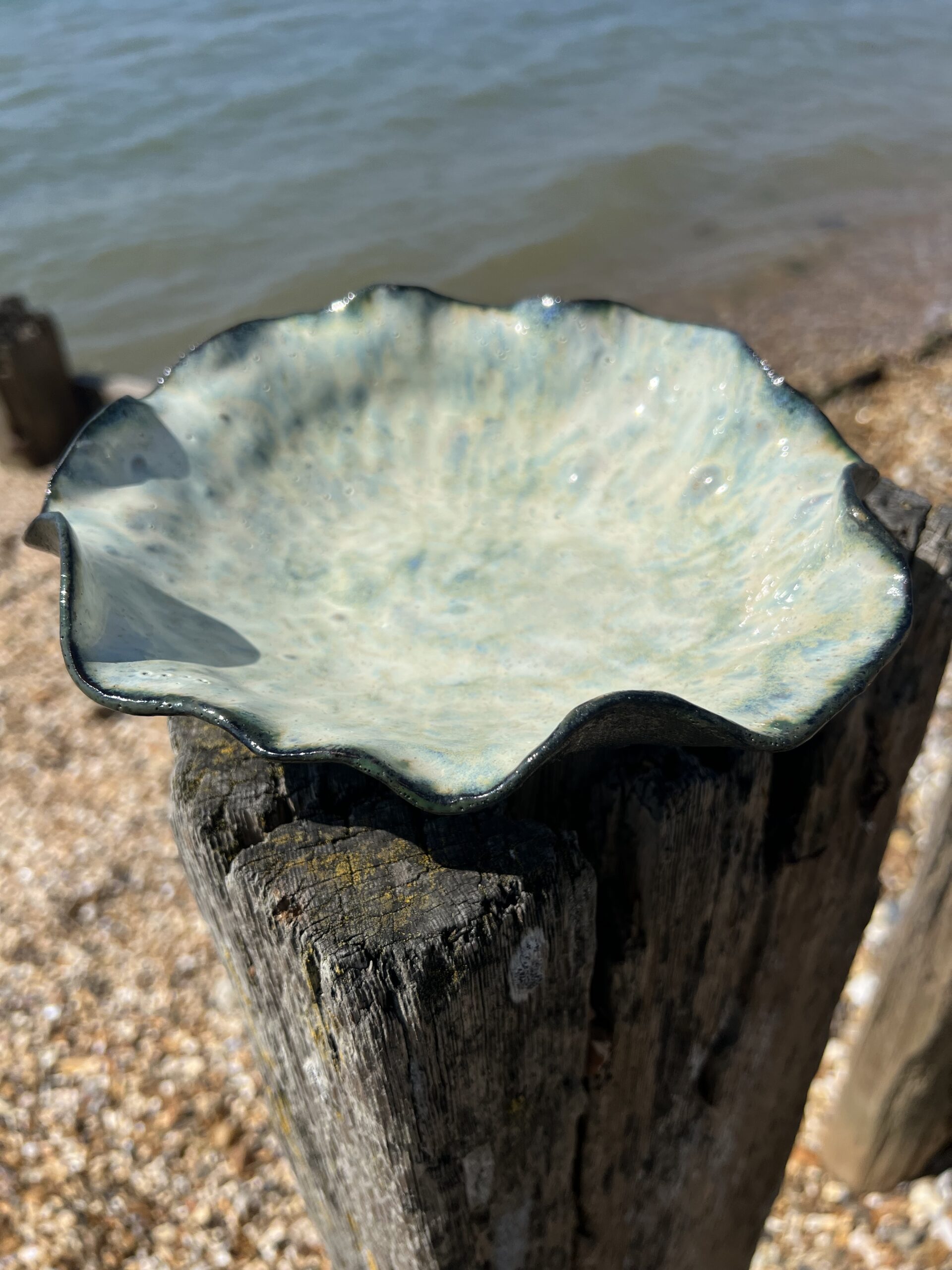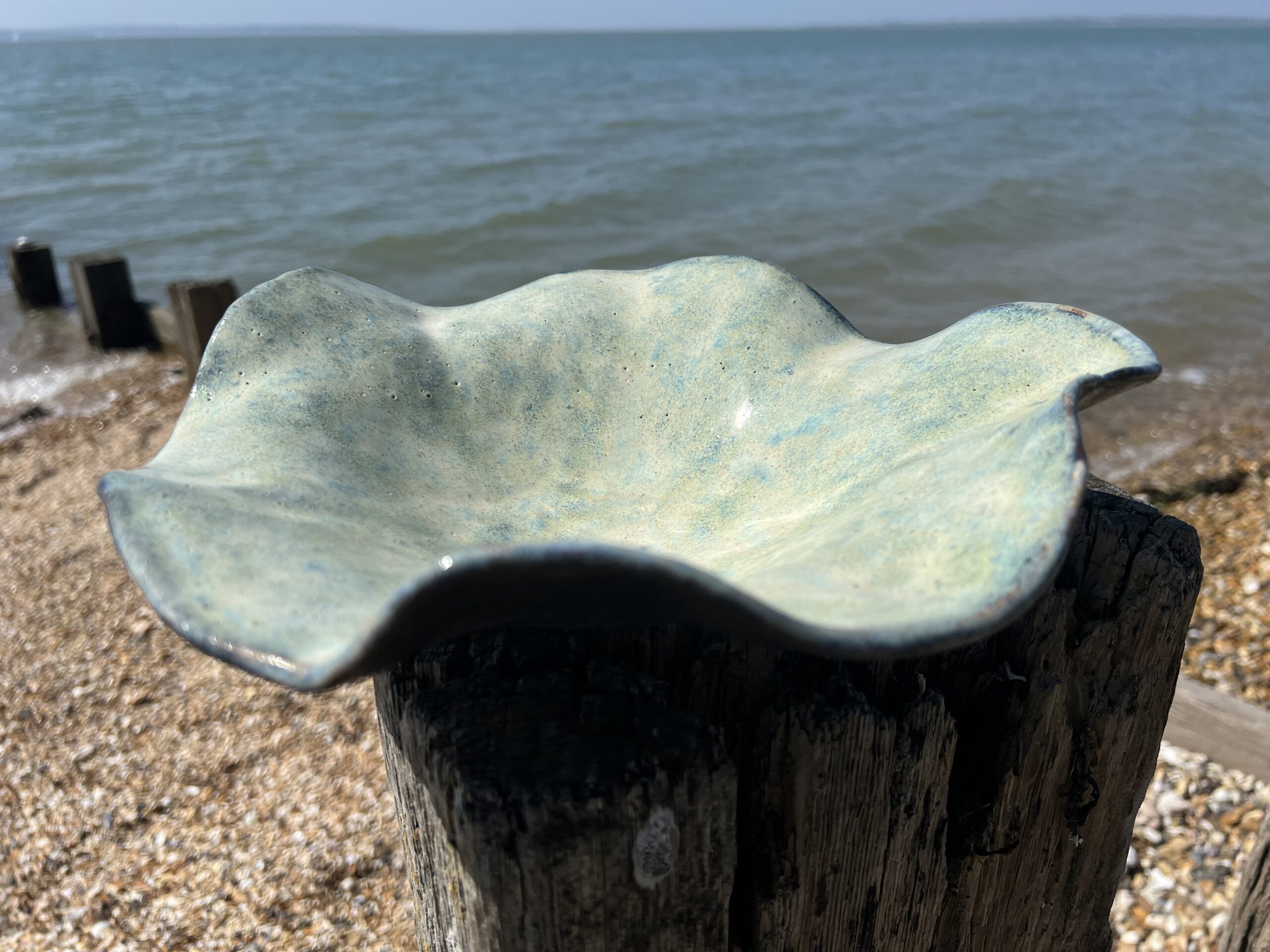 Wavy shell-like over-sized dish. Glassy green glaze inside, deep matt blue outside